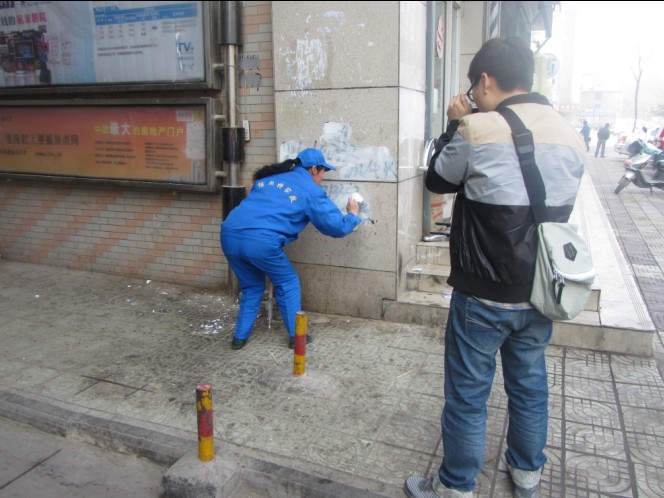 清理野廣告是一件非常不容易的事,有時(shí)候由于貼紙粘貼得太黏,只能是先用手摳,再用刀子輕輕劃,費(fèi)了好大的勁,才能清理掉一張野廣告。在現(xiàn)場(chǎng)記者了解到,兩年前政府出25-30萬來派專業(yè)的公司來完成野廣告清理工作,但效果都不佳。而我們博思特公司卻用13萬的費(fèi)用承接了這項(xiàng)業(yè)務(wù),并產(chǎn)生了很好地效果,這就體現(xiàn)了13>25的 效應(yīng)。記者在采訪李董事長(zhǎng)時(shí),她說道:“在兩三年前,渭南市里的野廣告隨處可見,自從我們博思特接了這項(xiàng)業(yè)務(wù)后,在城市中想找到一張野廣告都很難了!