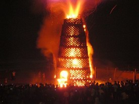 中秋夜燒塔在一些地方也很盛行。塔高1—3公尺不等,多用碎瓦片砌成,大的塔還要用磚塊砌成,約占塔高的1/4,然后再用瓦片疊砌而成,頂端留一個(gè)塔口,供投放燃料用。