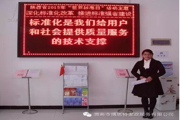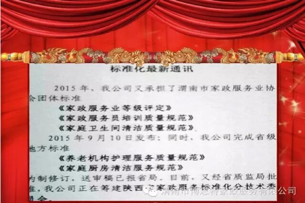 | 渭南市博思特家政服務(wù)有限公司 讓標(biāo)準(zhǔn)成為習(xí)慣 讓習(xí)慣符合標(biāo)準(zhǔn) 渭南市博思特家政服務(wù)有限公司制定標(biāo)準(zhǔn)206項,其中國家標(biāo)準(zhǔn)53項,行業(yè)標(biāo)準(zhǔn)5項,地方標(biāo)準(zhǔn)4項,企業(yè)標(biāo)準(zhǔn)144項,辦公室引用101項,家政部引用49項,工程部引用34項,人力資源部引用7項,財務(wù)部引用5項。 2014年8月發(fā)布陜西省地方標(biāo)準(zhǔn)《家政服務(wù)指南 母嬰護(hù)理》、《家政服務(wù)指南 居家養(yǎng)老護(hù)理》 ; 2014 年9月發(fā)布渭南市標(biāo)準(zhǔn)《家政服務(wù) 搬家服務(wù)質(zhì)量規(guī)范》、《家政服務(wù) 育嬰服務(wù)質(zhì)量規(guī)范》、《養(yǎng)老機(jī)構(gòu)服務(wù)質(zhì)量范》; 2015年9月發(fā)布渭南市家政服務(wù)團(tuán)體(聯(lián)盟 )標(biāo)準(zhǔn)《家政服務(wù)企業(yè)等級劃分與評定》、《家政服務(wù)員培訓(xùn)質(zhì)量規(guī)范》、《家庭衛(wèi)生間清潔服務(wù)質(zhì)量規(guī)范》; 2015年送審稿已報批,為陜西省地方標(biāo)準(zhǔn)《養(yǎng)老機(jī)構(gòu)護(hù)理服務(wù)質(zhì)量規(guī)范》、《家政服務(wù)指南—家庭廚房保潔》。 博思特家政服務(wù)有限公司 標(biāo)準(zhǔn)化工作機(jī)構(gòu)設(shè)置 公司設(shè)立以總經(jīng)理為首的標(biāo)準(zhǔn)化委員會,負(fù)責(zé)領(lǐng)導(dǎo)全公司的標(biāo)準(zhǔn)化工作,公司標(biāo)準(zhǔn)化組織由四個層次組成,即公司標(biāo)準(zhǔn)化管理委員會,公司標(biāo)準(zhǔn)化工作管理小組(設(shè)在辦公室),各職能部門標(biāo)準(zhǔn)化主管領(lǐng)導(dǎo)及部門標(biāo)準(zhǔn)化兼職管理員組成的公司標(biāo)準(zhǔn)體系工作組。 1.標(biāo)準(zhǔn)化工作機(jī)構(gòu)的最高領(lǐng)導(dǎo)者是公司總經(jīng)理; 2.標(biāo)準(zhǔn)化委員會由總經(jīng)理、質(zhì)量體系的管理者代表(常務(wù)副總經(jīng)理)。公司主要職責(zé)能部門負(fù)責(zé)人及標(biāo)準(zhǔn)化有關(guān)專家組成,由總經(jīng)理擔(dān)任標(biāo)準(zhǔn)化委員會主任,標(biāo)準(zhǔn)化委員會設(shè)秘書組,由公司辦公室主任擔(dān)任秘書長; 3.公司辦公室是標(biāo)準(zhǔn)委員會日常工作和對公司及公司各部門標(biāo)準(zhǔn)化工作統(tǒng)一歸口管理; 4.標(biāo)準(zhǔn)體系工作組由公司各部室標(biāo)準(zhǔn)化主管領(lǐng)導(dǎo)和兼職標(biāo)準(zhǔn)化管理員組成,業(yè)務(wù)上受公司辦公室指導(dǎo),承擔(dān)所在部門的標(biāo)準(zhǔn)化管理職責(zé)。 陜西地方標(biāo)準(zhǔn)宣貫----家政服務(wù)指南 母嬰護(hù)理 宣貫單位:渭南市博思特家政服務(wù) 今日宣貫內(nèi)容: